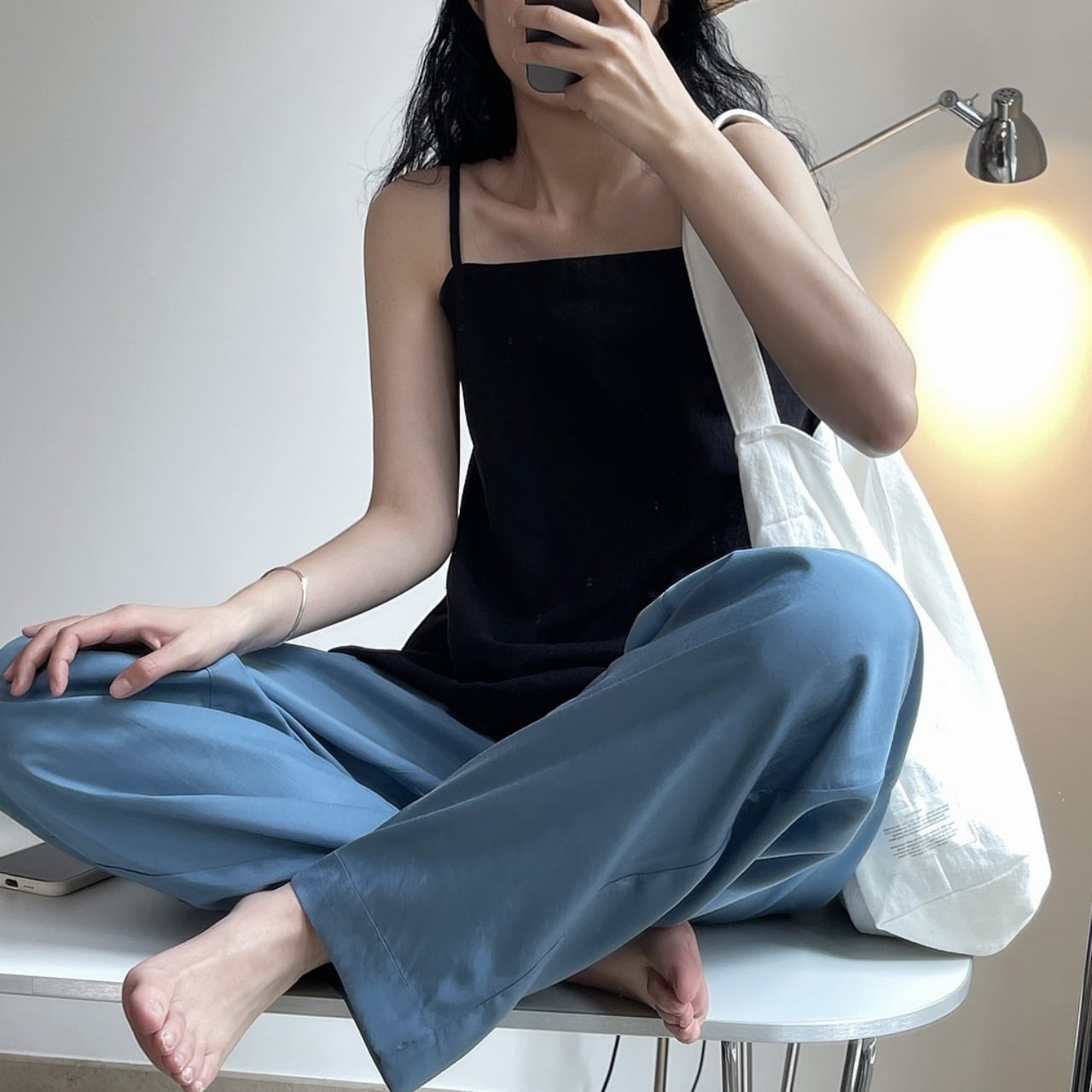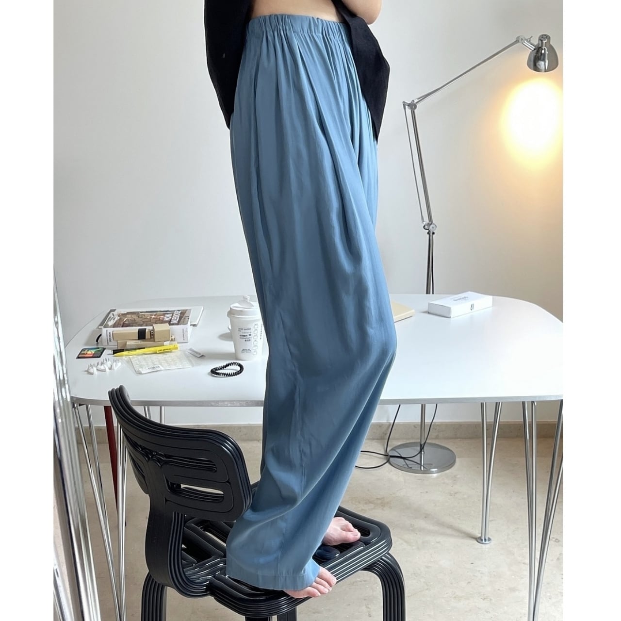 光沢感のあるしなやかなワイドパンツ。