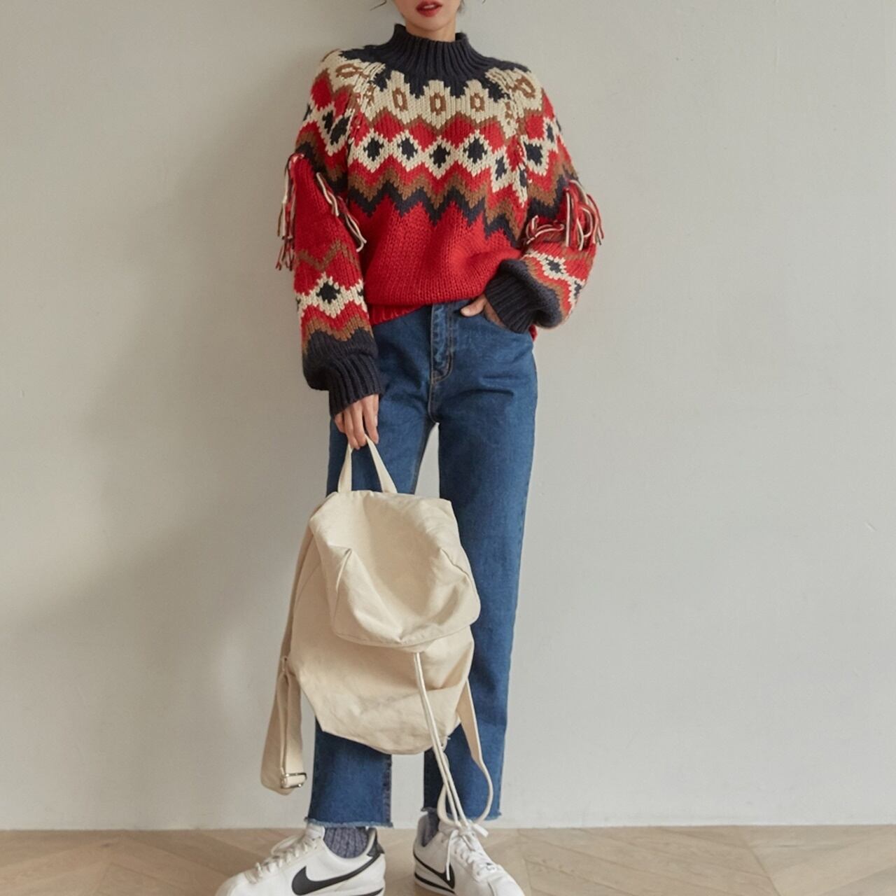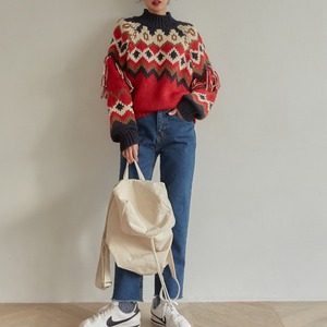 レトロ感あるハイネックセーター。