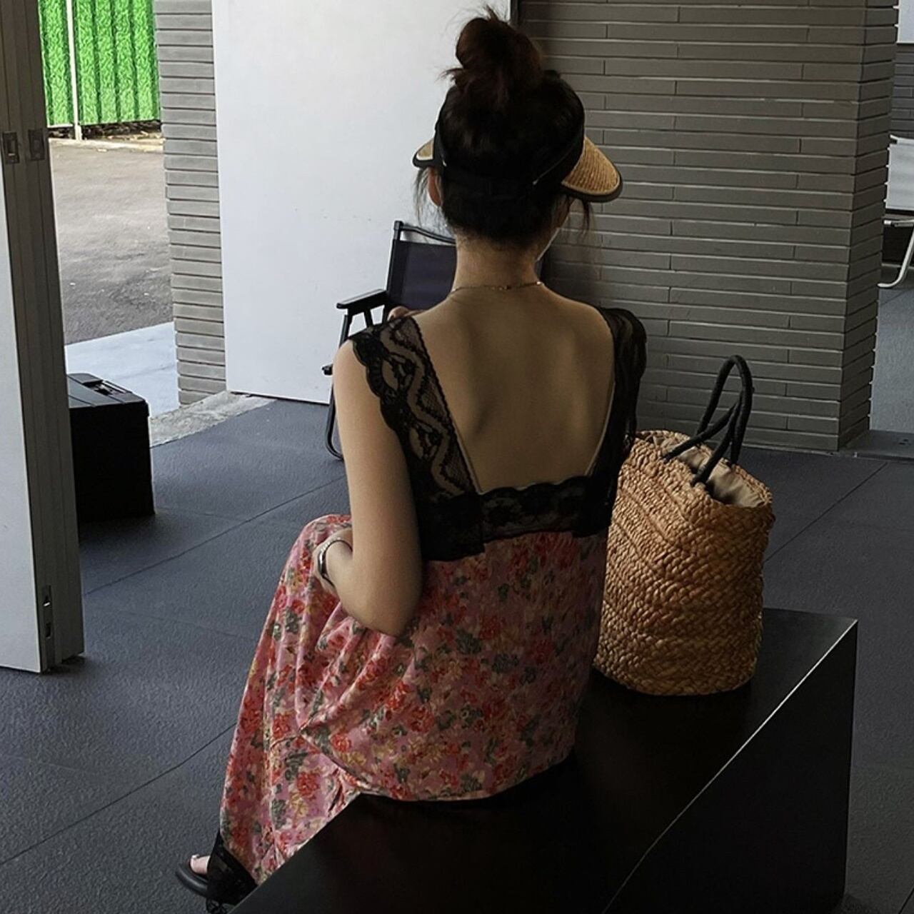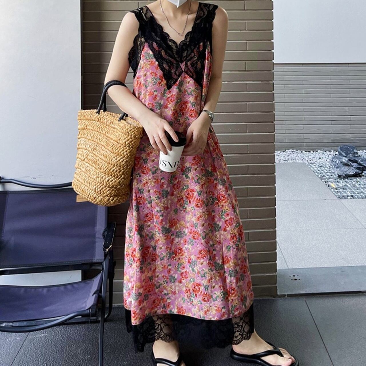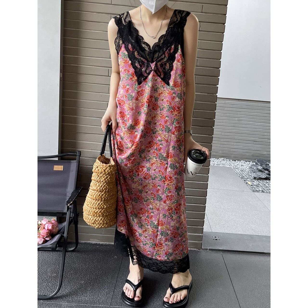 ブラックレースとピンクベースの花柄が絶妙にマッチしたノースリーブワンピース。