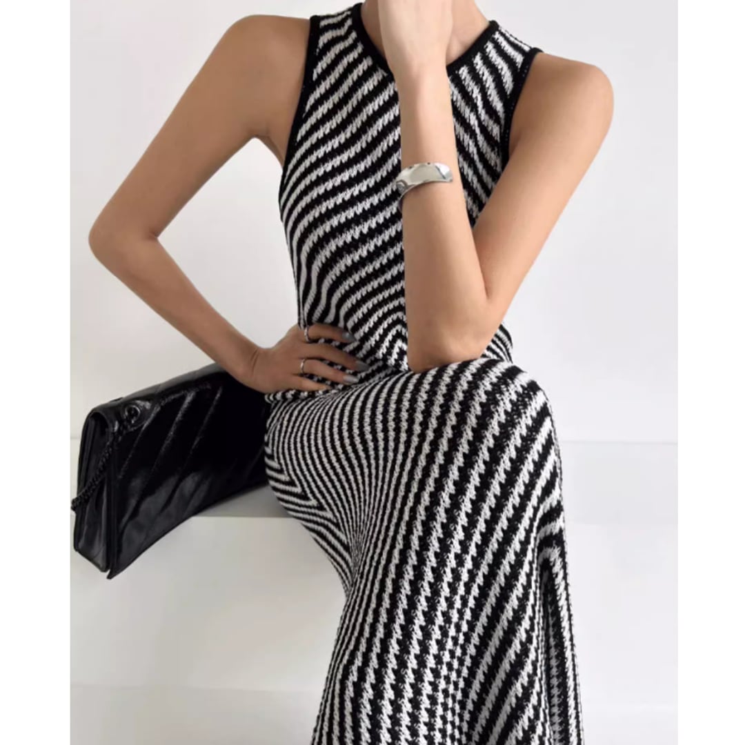 女性らしいマーメイドラインのシルエットが美しいノースリーブワンピース。